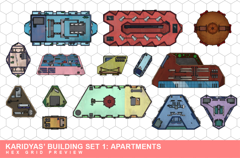 Modern, gritty apartment blocks and office buildings for your urban, mech-scale environment maps - and a bonus water tower! 💦