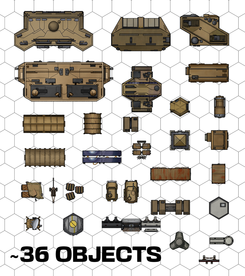 Hexagon grid mech-scale assets for LANCER or similar RPGs. Everything you need to make a military camp including walls, buildings, tents, electricals, weapons, vehicles, and the all-important crates of varying sizes.